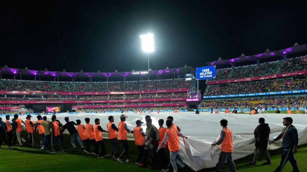 The RR vs RCB match has been delayed due to rain at the Barsapara Cricket Stadium in Guwahati. It started raining before the toss, and the ground staff was told to cover the pitch. There is no official confirmation on the new timings of the toss, with the officials waiting for the rain to pass before making a call.